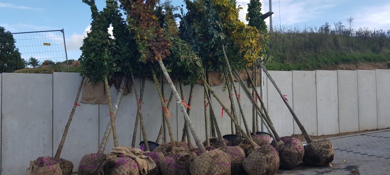 Anlieferung von 25 Bäumen (Magnolie, Ahorn, Kastanie, Esche etc.), über 2.800 St. Bodendecker und über 180 Sträuchern