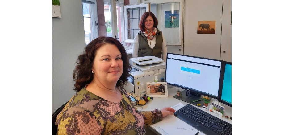 Bürgermeister Albert Ungermann dankt den Mitarbeiterinnen Iris Bathon und Nadine Hentschel für die federführende Umsetzung des Projektes, welches ein weiterer Schritt zur Verwaltungsdigitalisierung in Linsengericht ist.