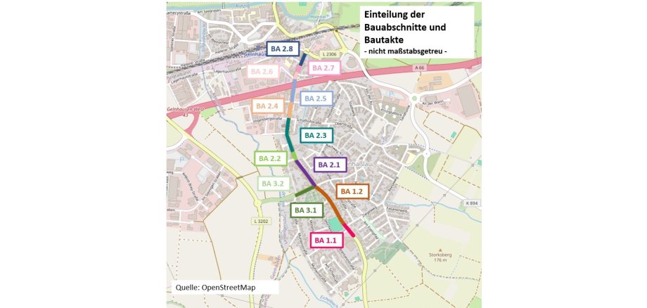Im zweiten Bauabschnitt konzentrieren sich die Arbeiten auf die L 2306 („Gelnhäuser Straße“) im Bereich zwischen der Einmündung der L 3202 („Hauptstraße“) und dem Abzweig „Elf Morgen“. Dieser Abschnitt wird nach aktueller Planung bis Mitte Juni 2026 bearbeitet. Anschließend werden die Bauarbeiten in weiteren Bautakten fortgesetzt.